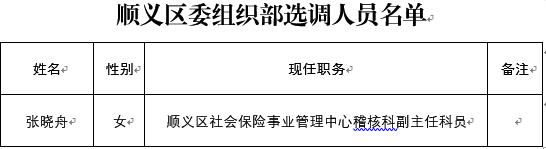 根据《中共北京市顺义区委组织部2017年公开选调干部公告》安排及要求,经过报名、资格审查、笔试、面试、考察与体检等程序,经区委组织部部长办公会研究,确定张晓舟同志为顺义区委组织部选调人员,现予以公示。